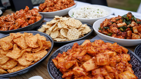 A vibrant display of spicy snacks and appetizers arranged in bowls. The image captures the tempting textures and colors, perfect for gatherings or events.