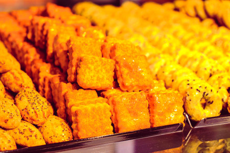 Eastern sweets, confectionery on the counter, Sherbet, Dzhezerye, halva, Turkish delight baklava. Istanbul the capital of Turkey