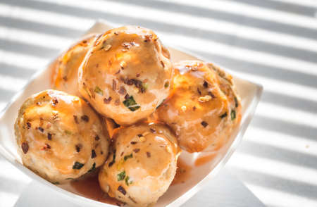 Meatball in sweet sauce in a paper plate on hand, thai food style.