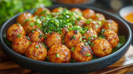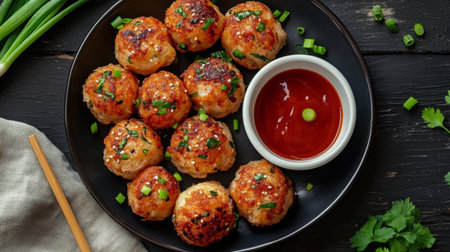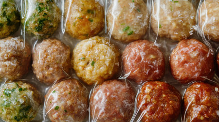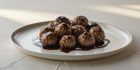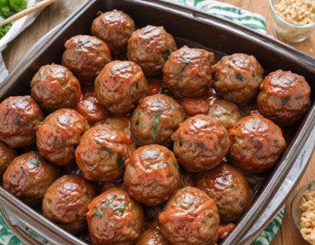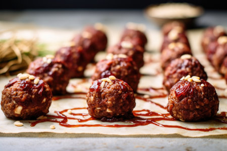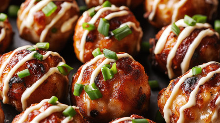 Rows of Spicy Meatballs on a Reflective Surface. Generative AI.