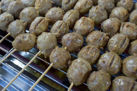 Meatballs Grilled with bamboo stick, Thai Style Barbecue beef, Thai street food favorites.