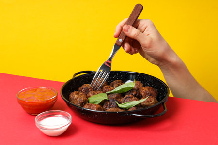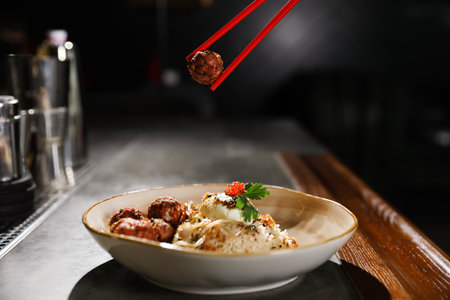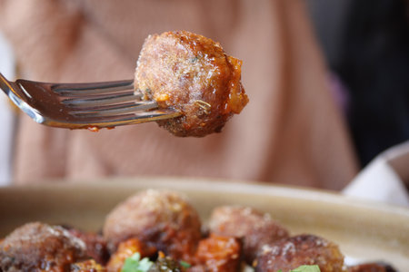 Delicious meatball being lifted from a plate at a cozy restaurant