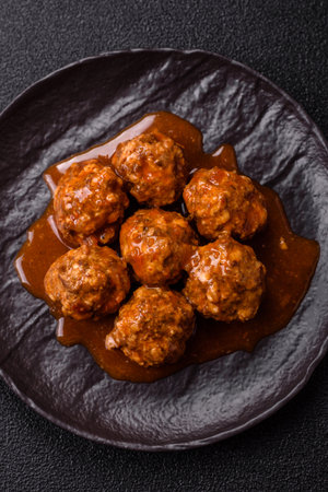 Meat, meatballs in tomato sauce, Italian food, beef or pork with salt and spices. Meatballs with tomatoes as a background for your design