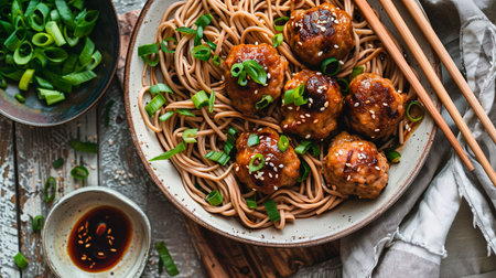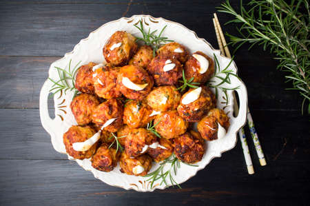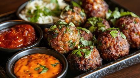 Meatballs on plate with with spicy sauce, Grilled meatball and pork ball, Meat ball on skewers and fresh coriander vegetables cabbage, Thai food Asian food Meat balls - pork balls