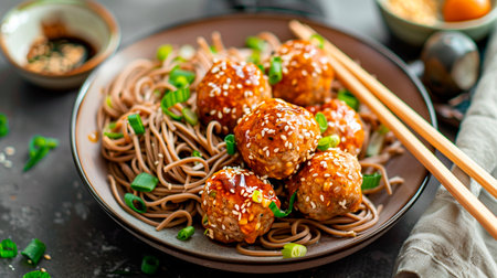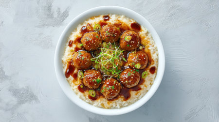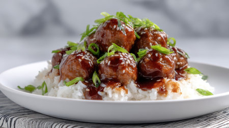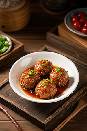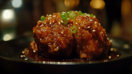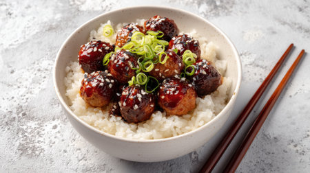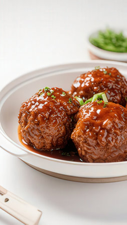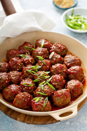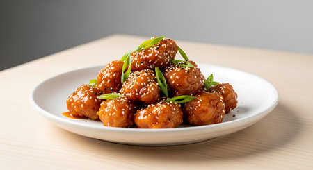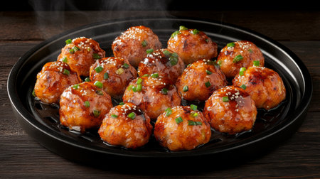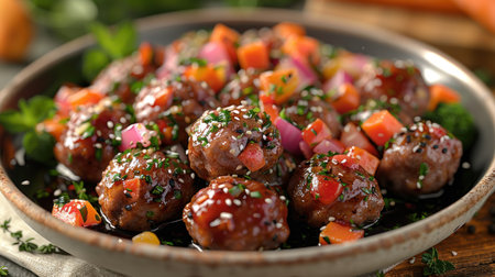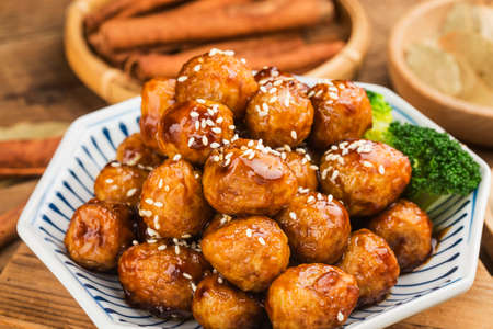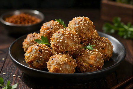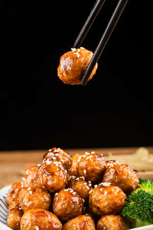 Meatballs in sweet and sour sauce with sesame seeds in a bowl