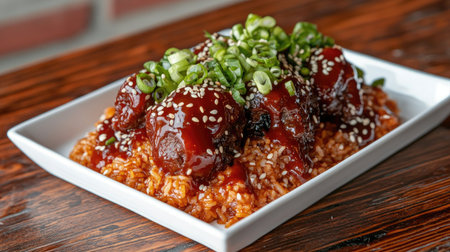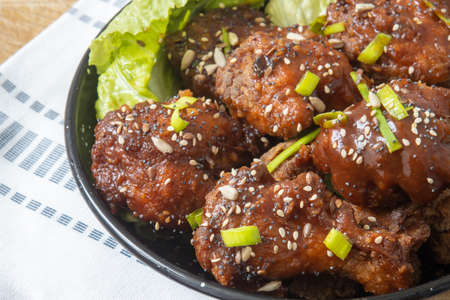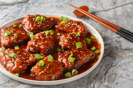 Sweet and sour pork chops are delicious and covered in a glaze made out of brown sugar, soy sauce, hoisin and Worcestershire sauce closeup on the plate on the table. horizontal