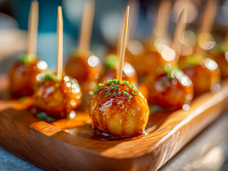 Elegant wooden tray showcases gleaming bite-sized treats garnished with fresh herbs and drizzled with rich sauce, perfect for sophisticated tasting events or celebra