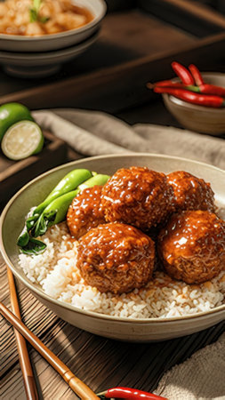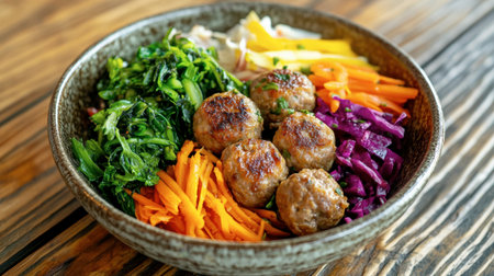 Bowl of spicy soup with meatballs and vegetables on wooden table