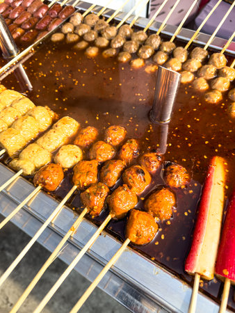 Fried food with sticks, Thai style food, Street food in Bangkok, Thailand, close up