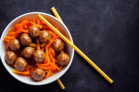 Juicy balls of their minced pork with orange carrots in a white bowl on a dark background 3d illustration