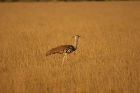 An African bustard Neotis standing in a dry, grassy savanna, bathed in golden light, showcasing wildlife in a natural habitat.