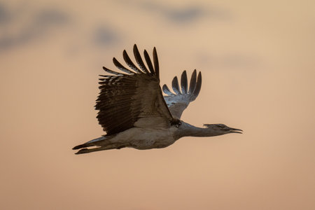 Kori bustard flying in silhouette opening beak