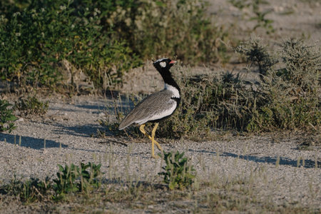 Northern Black Bustard (Afrotis afraoides) walking in Kalahari desert sand with yellow flower in his bill.