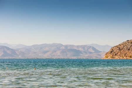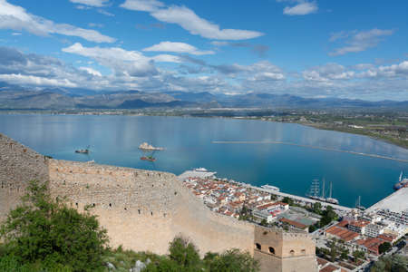 Landscape with view on Nafplio from above, seaport town in the Peloponnese in Greece, capital of region Argolis, tourist travel and vacation destination