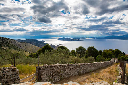 Moni Osiou Patapiou, Greek Republic. Mountains and water, blue sea. 14. Sep. 2019.