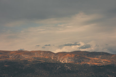 A rugged mountain range rises under dramatic layered clouds, creating a moody and atmospheric natural landscape.