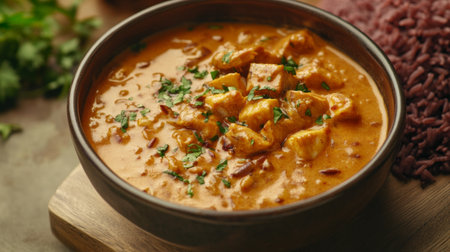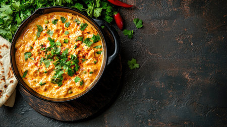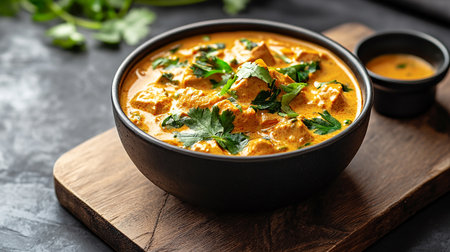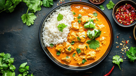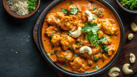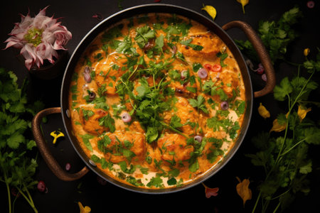 aerial view of chicken tikka masala garnished with cilantro, created with generative ai