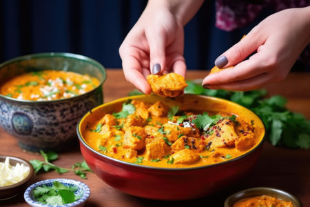 hand passing bowl of chicken tikka masala to another hand, created with generative ai