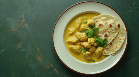 A warm bowl of chicken curry paired with soft flatbread, topped with fresh cilantro, perfect for a hearty meal, showcasing vibrant flavors and aromatic spices.