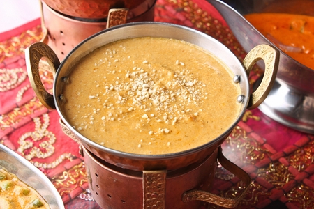 Delicious Mulligatawny soup in metal bowl, traditional Indian cuisine