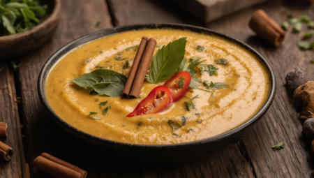 A bowl of creamy pumpkin soup is garnished with cinnamon sticks, chili pepper, and fresh herbs, sitting on a rustic wooden table.