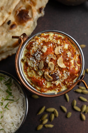 Top view of a serving of chicken korma in a traditional bowl, surrounded by spices and herbs, with naan bread artfully