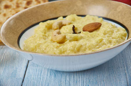 Gurer payesh, rice pudding, Bengali cuisine, Asia Traditional assorted dishes, Top view.