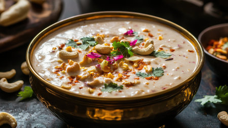 A close-up of Indian kaju masala, or cashew curry, served in a traditional bowl, garnished with fresh herbs, perfect for an authentic taste experience.