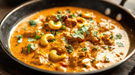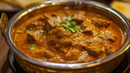 A vibrant and inviting Indian curry dish featuring tender meat simmered in rich spices and finished with fresh herbs. Ideal for dining experiences.