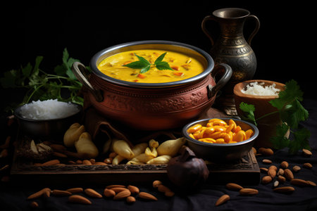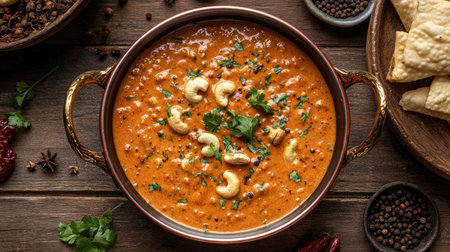 An elegant bowl of chicken korma on a rustic table, complemented by colorful spices and herbs,eed0685badf5