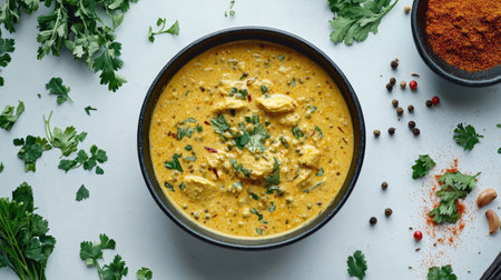A bowl of creamy chicken korma surrounded by fresh herbs and spices, positioned against a clean background, creating a perfect area for captions or branding.