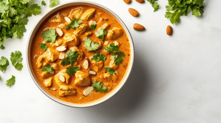 A rich bowl of chicken korma garnished with fresh cilantro and almonds, set against a soft white background,