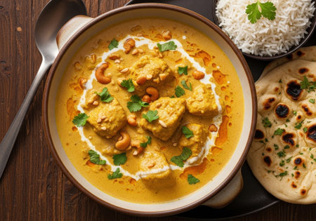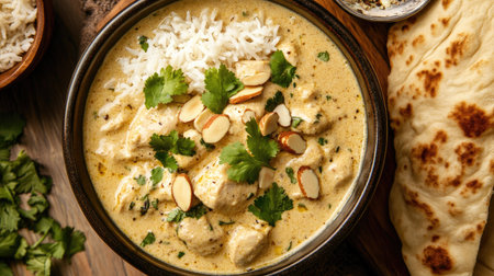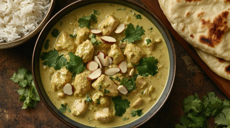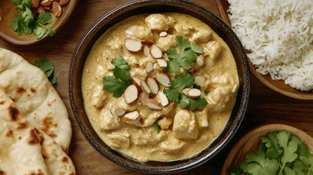 Aerial view of a bowl of creamy chicken korma garnished with fresh cilantro and sliced almonds, beautifully arranged alongside naan and rice,
