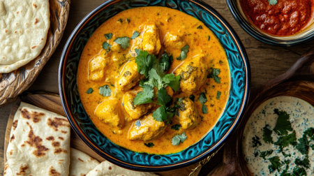 Aerial shot of chicken korma served in a vibrant bowl, accompanied by a variety of dips and flatbreads, highlighting the colors and textures of this delicious dish.
