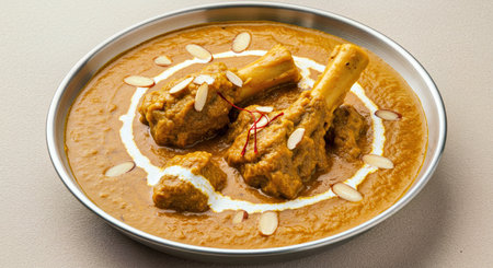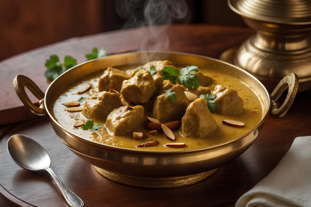 East Indian Food Lamb Korma Curry. on a metal bowl.