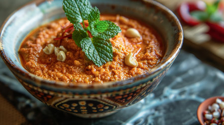 A delicious bowl of beef stew garnished with fresh mint and chili. This savory dish features rich flavors and a comforting aroma, perfect for any meal.