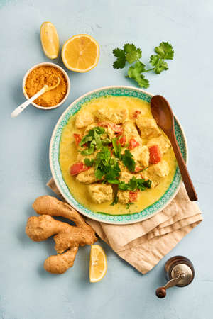 Chicken curry with rice and spices - a traditional popular Indian dish, selective focus