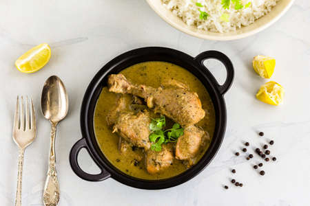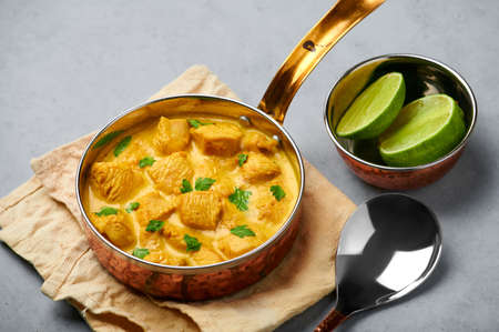 Chicken Korma in copper pan on gray concrete table top. Indian cuisine meat curry dish with coconut milk masala. Asian food