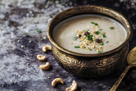 Creamy porridge in an ornate bowl garnished with cashews, raisins, and fresh herbs on a textured background