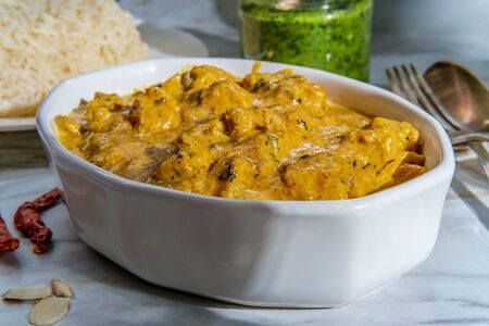 Authentic Indian almond chicken korma curry dinner with basmati rice and green chutney
