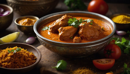 A mouthwatering chicken curry dish paired with fluffy rice, garnished with fresh herbs, showcasing vibrant colors and rich flavors ideal for culinary enthusiasts.