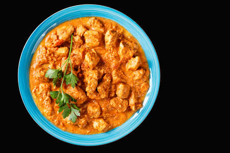 murgh makhani, butter chicken, curry of tandoori chicken in a spiced tomato and cream sauce on a blue plate on a black background, indian cuisine, horizontal view from above, flat lay, free space