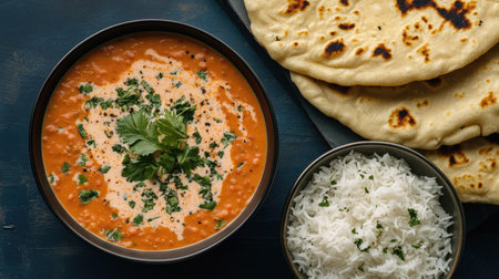 A modern minimalist presentation of red lentil soup with coconut milk, served with a side of fragrant basmati rice and warm naan on a dark blue table.