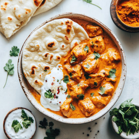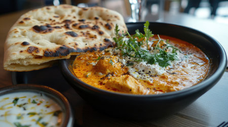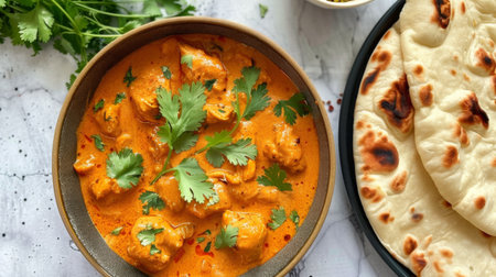 Indulge in a rich and creamy butter chicken dish served with fresh naan. This vibrant meal showcases the depth of Indian flavors and spices in every bite.