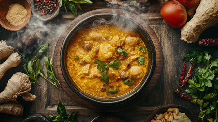A delicious curry dish filled with tender meat, fragrant spices, and fresh herbs, captured in a rustic setting with vibrant ingredients surrounding it.
