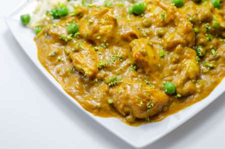 Chicken curry with egg fried rice, chicken breast pieces in a mildly spiced coconut curry sauce with fried rice with peas and egg, Indian food