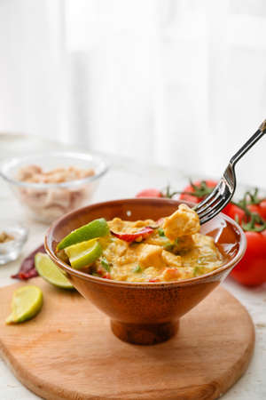 exotic dish in street cafe. Indian hot dish with spicy seasonings on table in tropical cafe.