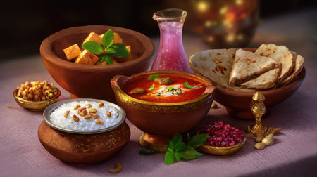 This captivating image showcases an array of vibrant Indian cuisine, including rich curries, soft breads, and colorful sweets, perfect for festive gatherings.