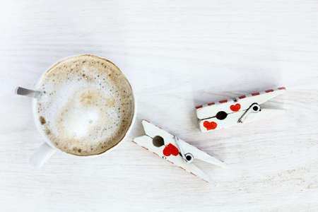 frothy cappuccino placed on a table on which is a pair of lovers clothespins / craving love and coffee