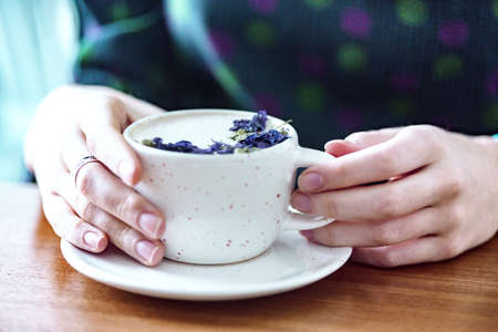 girl hands holding a cup of capuccino